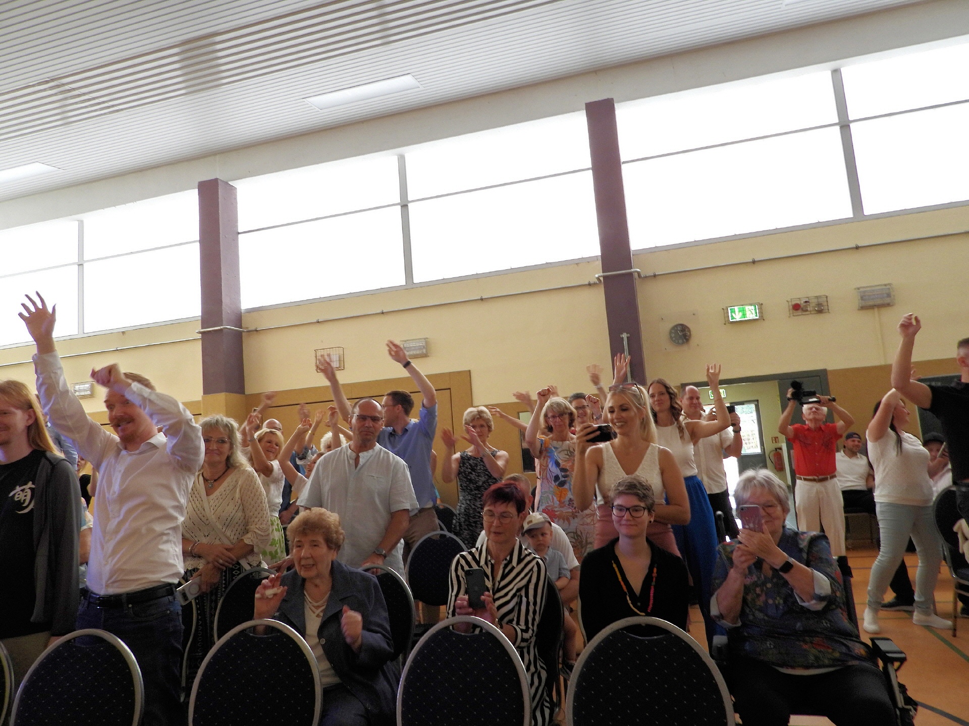 Die Messehalle füllte sich, um 15. 00 Uhr sollte das Konzert beginnen. Aufregend waren die letzten Minuten hinter dem Vorhang, leise sein, Konzentration halten. Der Einmarsch an die Plätze wurde vom Beifall begleitet, freuten sich doch die Eltern, endlich ihre Kinder zu sehen. Die Spannung war groß, haben sie die Veranstaltung intensiv vorbereitet und werden sie einen bleibenden Eindruck hinterlassen?