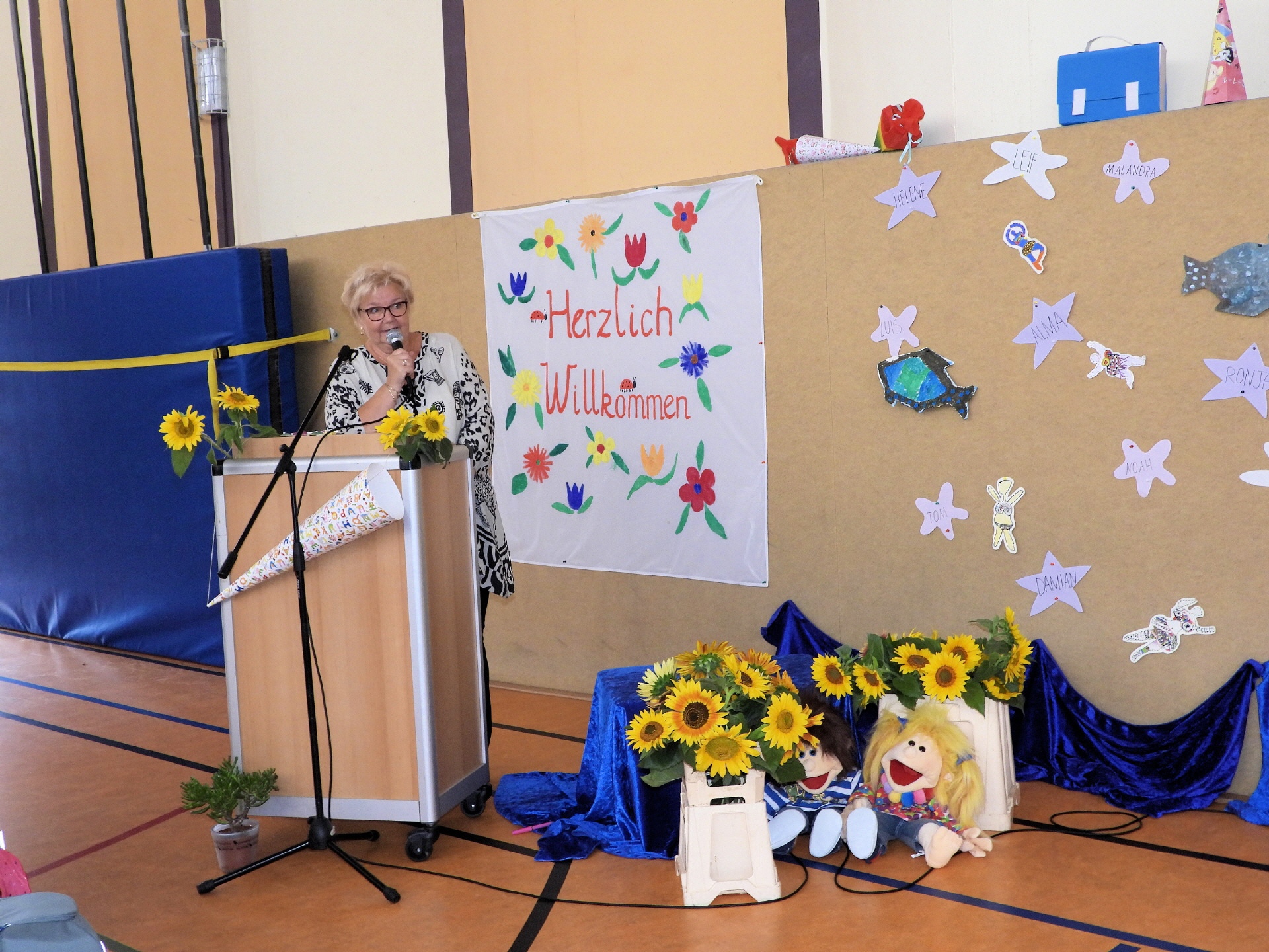 Frau Simon, die stellvertretende Schulleiterin, gratulierte jedem Kind persönlich zum Schuleingang und überreichte eine Sonnenblume, die wie jedes Jahr vom Töplitzer Einkaufsmarkt Zosky gesponsert wurde. Der amtierende Schulleiter, Herr Wäschke, konnte leider nicht an der Veranstaltung teilnehmen, da er mit seiner Familie selbst die Einschulung seines Kindes feierte.