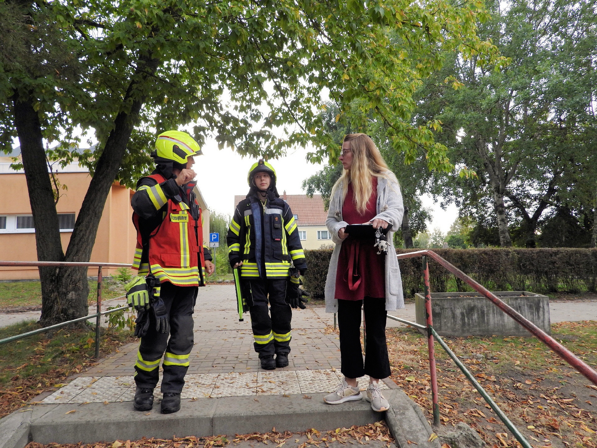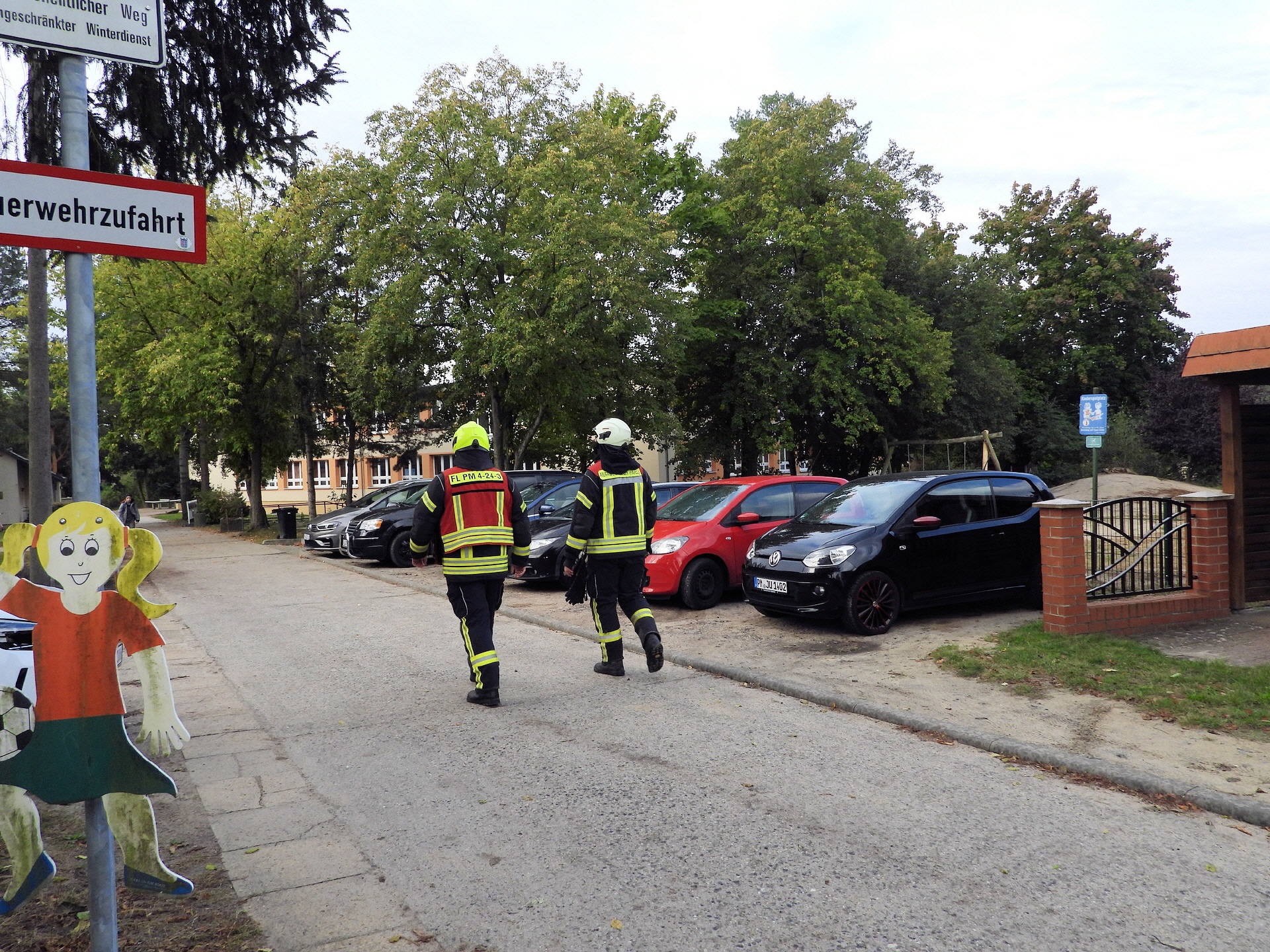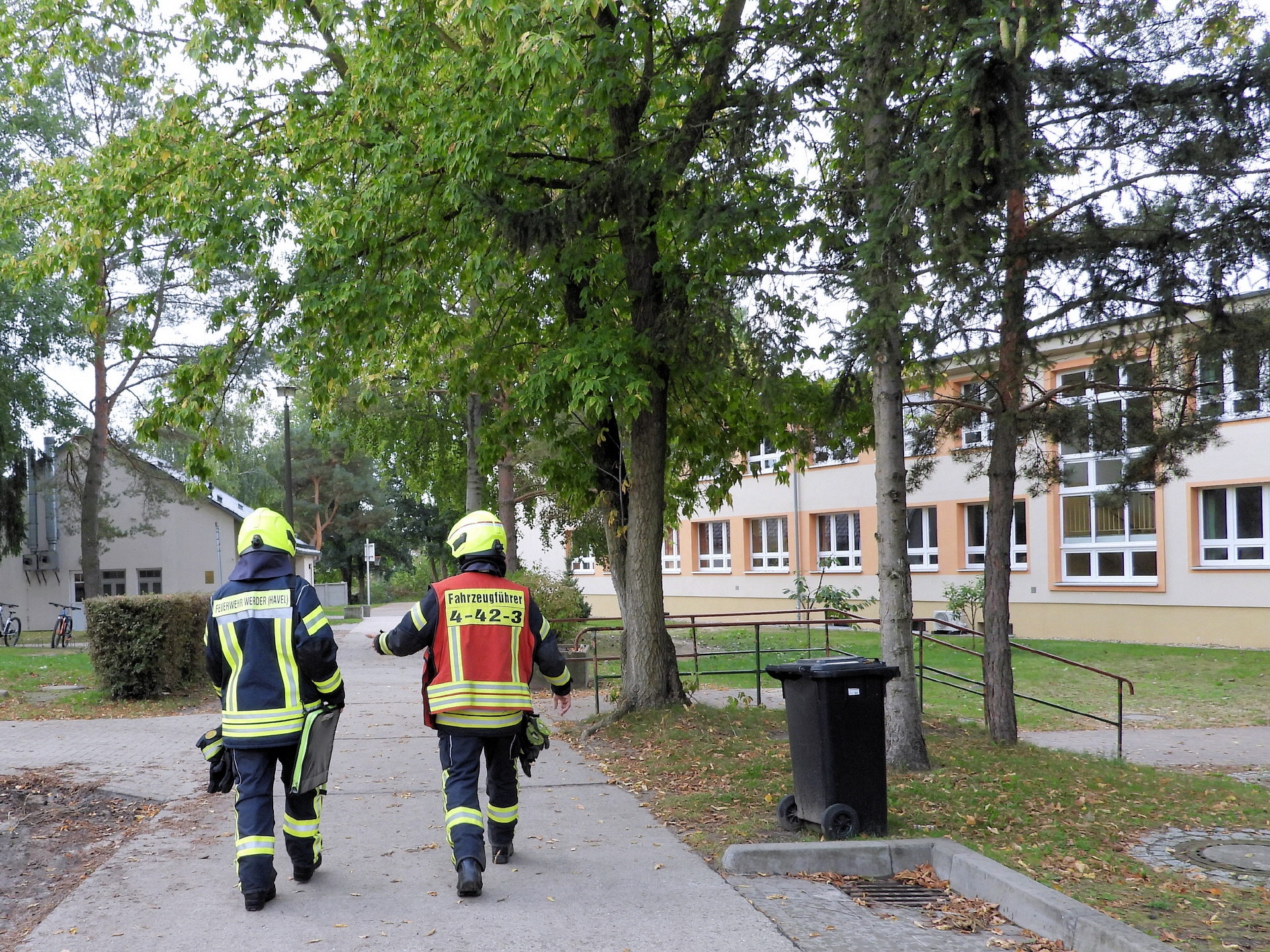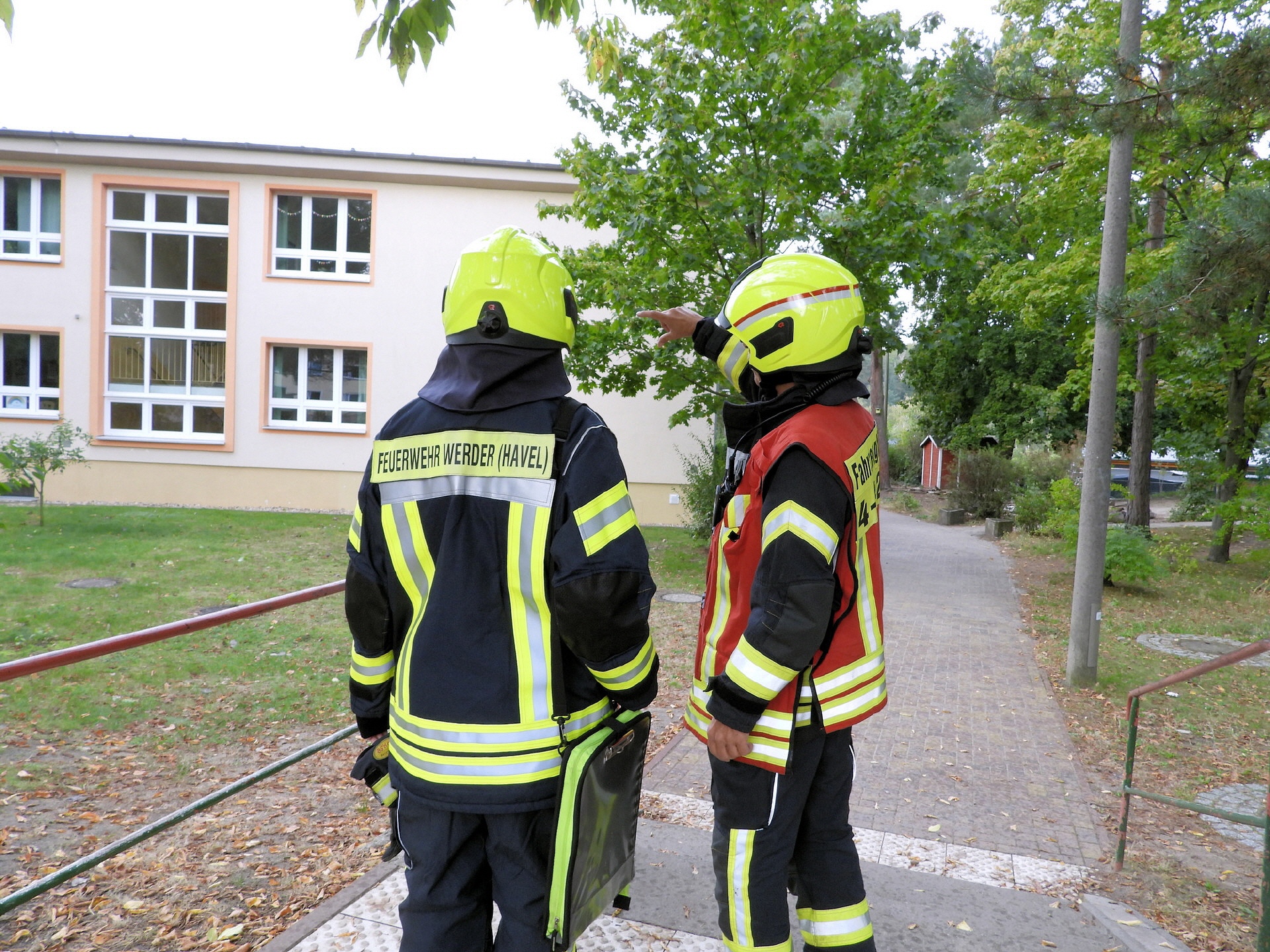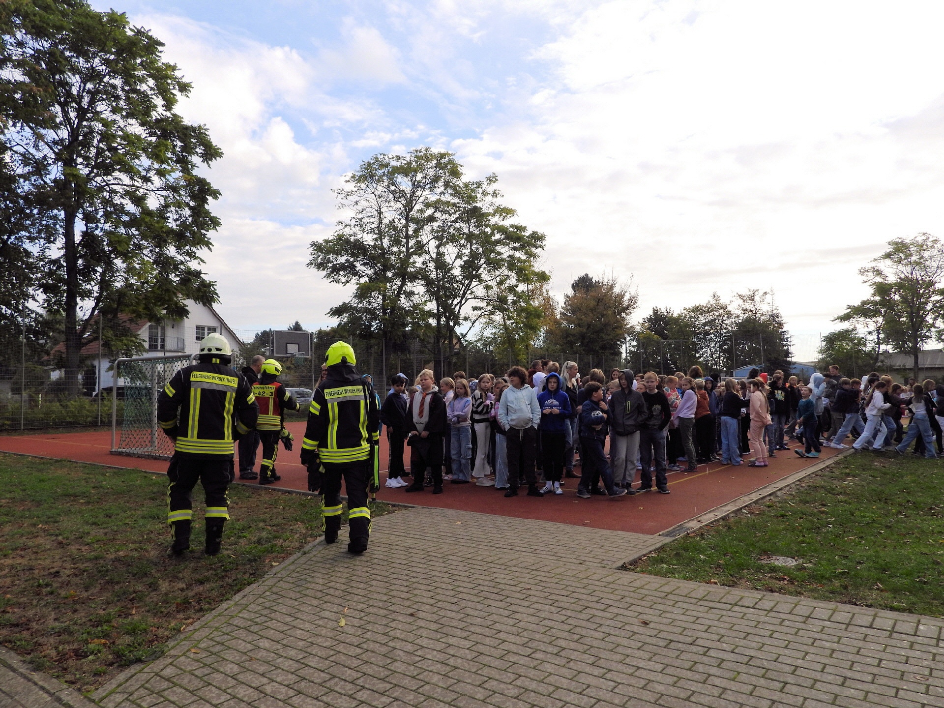 Und klar, was wäre ein Feueralarm ohne Feuerwehr? Kurz nach der Alarmierung kamen zwei Löschfahrzeuge der Freiwilligen Feuerwehr Werder / Ortsfeuerwehr Töplitz angefahren. Das hat natürlich auch die "ganz Kleinen", die sowas noch nicht kannten, ziemlich aufgeregt. Als es dann leicht anfing zu regnen, sind die Schüler*innen in die Turnhalle der Inselschule gegangen, wo sie weiter von Erzieher*innen, Lehrer*innen und Feuerwehrleuten betreut wurden.
