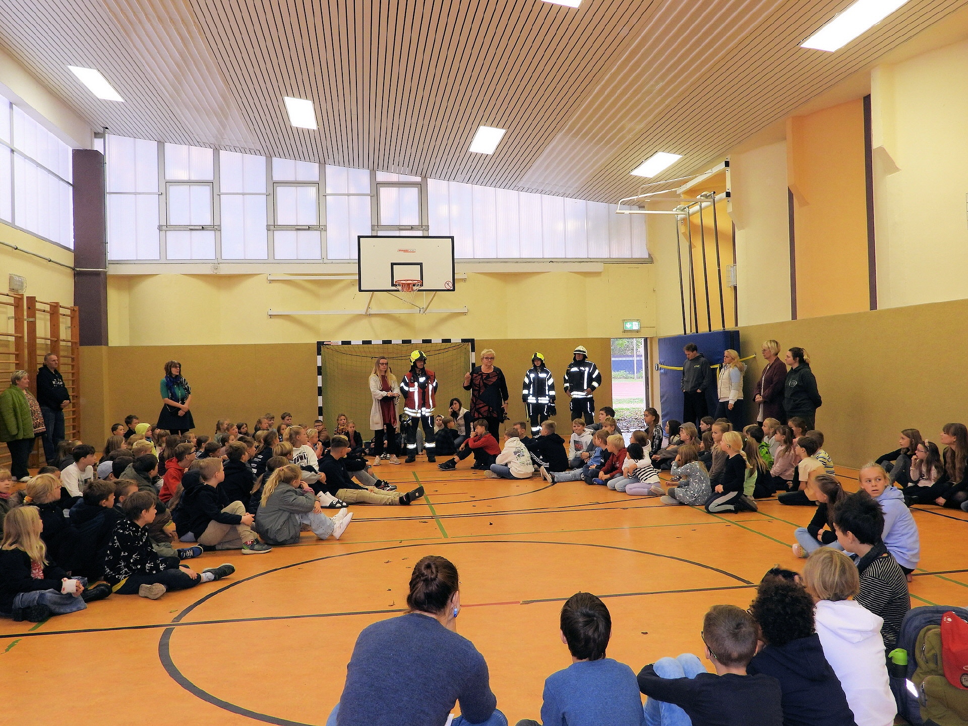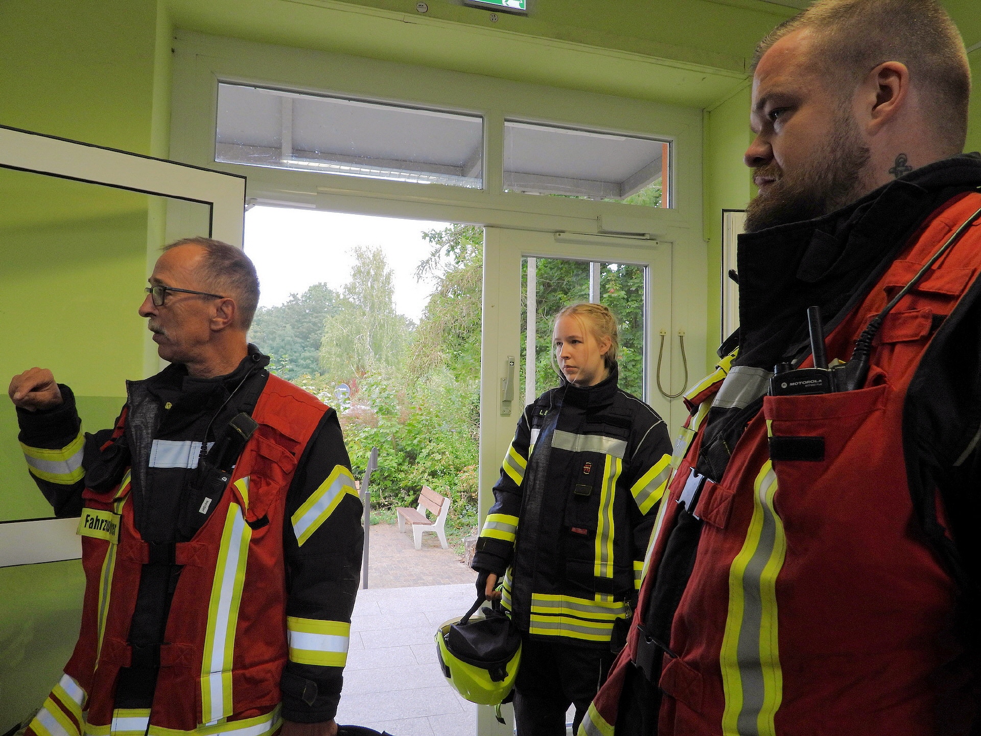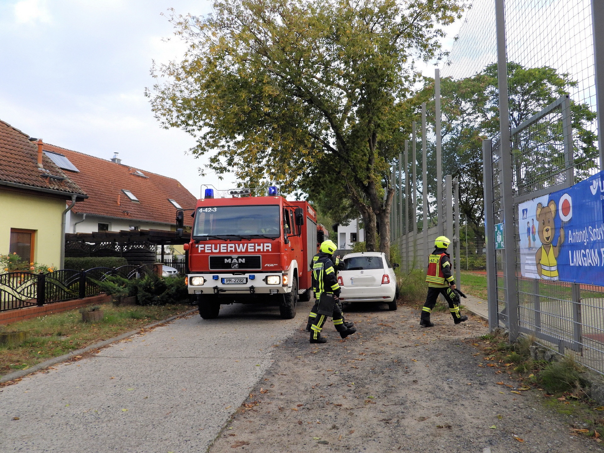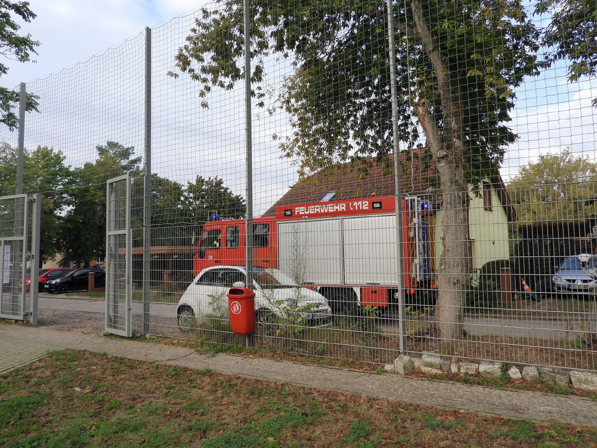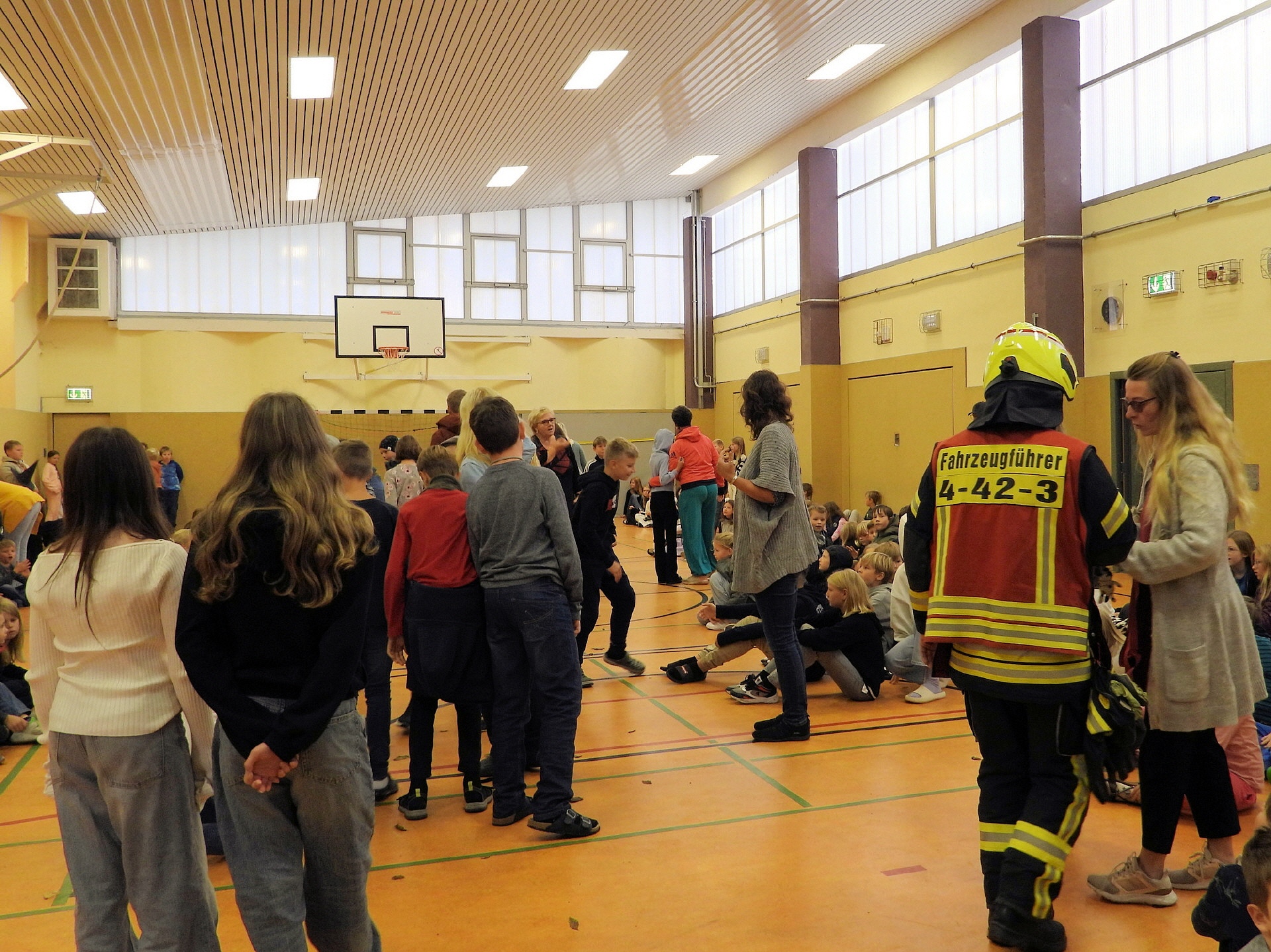 Und klar, was wäre ein Feueralarm ohne Feuerwehr? Kurz nach der Alarmierung kamen zwei Löschfahrzeuge der Freiwilligen Feuerwehr Werder / Ortsfeuerwehr Töplitz angefahren. Das hat natürlich auch die "ganz Kleinen", die sowas noch nicht kannten, ziemlich aufgeregt. Als es dann leicht anfing zu regnen, sind die Schüler*innen in die Turnhalle der Inselschule gegangen, wo sie weiter von Erzieher*innen, Lehrer*innen und Feuerwehrleuten betreut wurden.