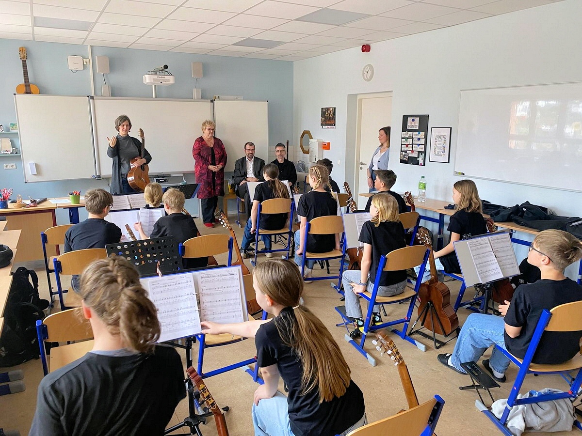 Ihre Begeisterung für Musik zog sich durch den Töplitzer Schulalltag: Seit 15 Jahren organisiert sie mit der Muskischullehrerin Regina Klieber die Gitarrenklassen im Rahmen des Landesprojekts „Klasse:Musik“. Schüler der fünften und sechsten Klassen erhalten dabei kostenlosen Gitarrenunterricht. „Ich finde es wichtig, dass Kinder Musik ganz praktisch erleben – auch wenn sie nicht alle perfekt spielen lernen“, sagt sie.